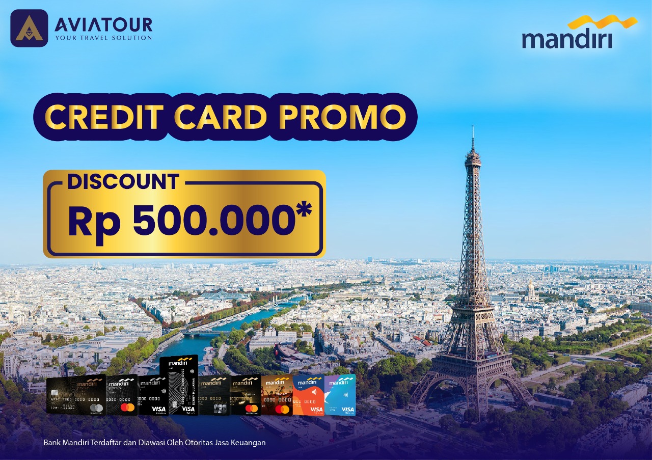 Khusus untuk Avians yang pengguna kartu kredit Mandiri, Avians bisa mendapatkan credit card promo! Dapatkan diskon sebesar Rp 500.000,- apabila Avians transaksi menggunakan kartu kredit Mandiri saat Online Travel Fair. Syaratnya hanya dengan transaksi minimal 3 juta rupiah. Mudah sekali kan?