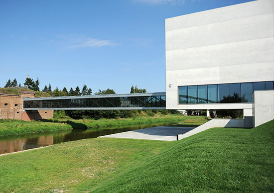 Bangunan dari Brama Poznania juga bisa dibilang cukup unik. Arsitekturnya terkesan moden dan elegan, seperti menggabungkan aspek masa kini dan aspek masa lalu. Kompleks bangunannya juga dirancang khusus dengan jembatan yang melewati Sungai Cybina. Unik,ya!