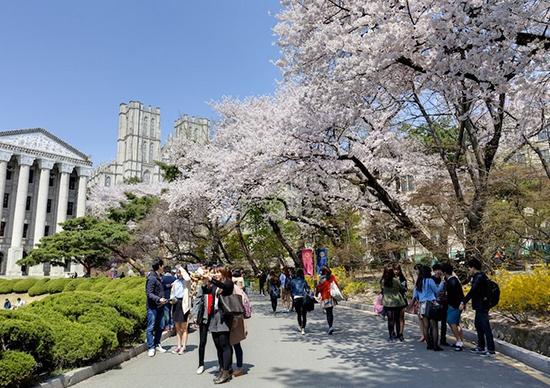 Avians ternyata juga bisa menikmati bunga sakura di kawasan Universitas Kyunghee,loh! Kampus ini terbuka untuk umum dan Avians dapat mengunjungi kampus ini untuk melihat keindahan bunga sakura di antara gedung-gedung berarsitektur Eropa. Banyak juga,loh orang yang datang ke kawasan kampus ini hanya untuk menikmati keindahan bunga sakura.